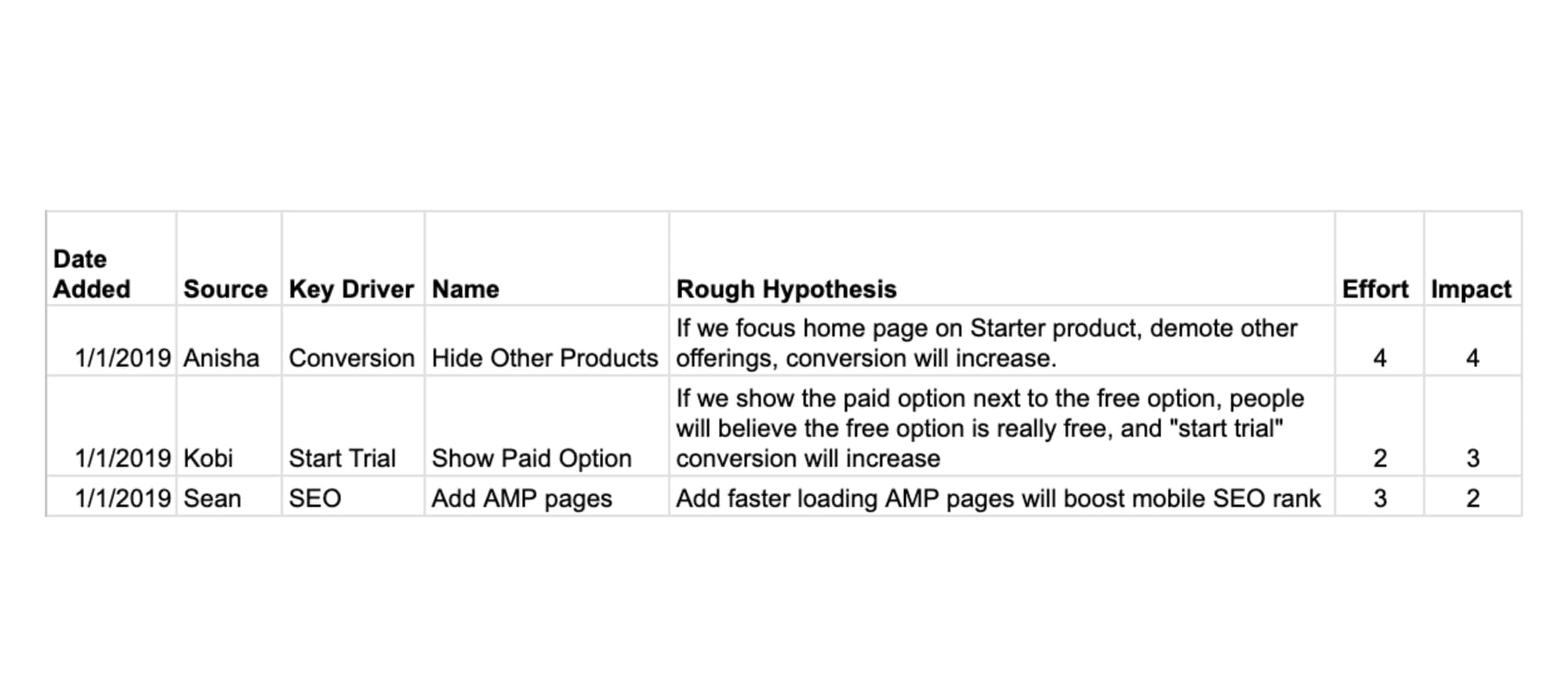 The scoring process will shorten your list of ideas, but you’ll still need to choose a few to test each week. If you can test more, great. Run as many good experiments as you can with your resources. Sometimes one test requires engineering, another one is just design and copy and the third is a customer service treatment, so you can run them all in parallel. But if all your ideas are landing page tests, then you’re more constrained. I find that fast-moving teams often set a goal of 3-5 per week.