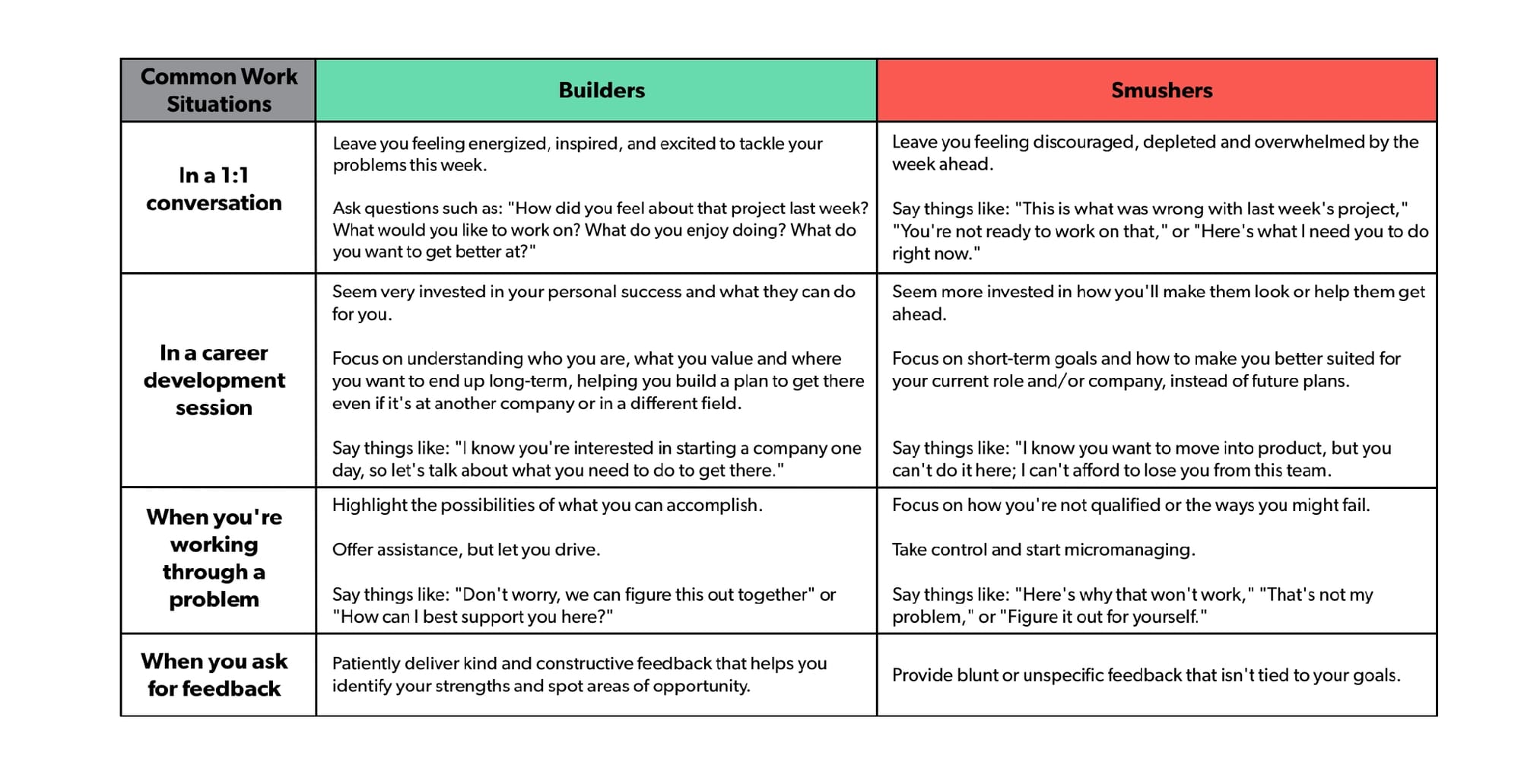 By contrast, smushers make you feel depleted and discouraged, by drawing attention to the ways you might fail. “I was looking to transfer to a new role within my team, so I went to the hiring manager for advice. I was told to leave the company, get experience somewhere else, then rejoin later,” says Ghadiyali. “I was taken aback by the feedback, because I was so invested and was already working toward that role. It took me a while to get over the feeling and recognize that it wasn’t great feedback.”