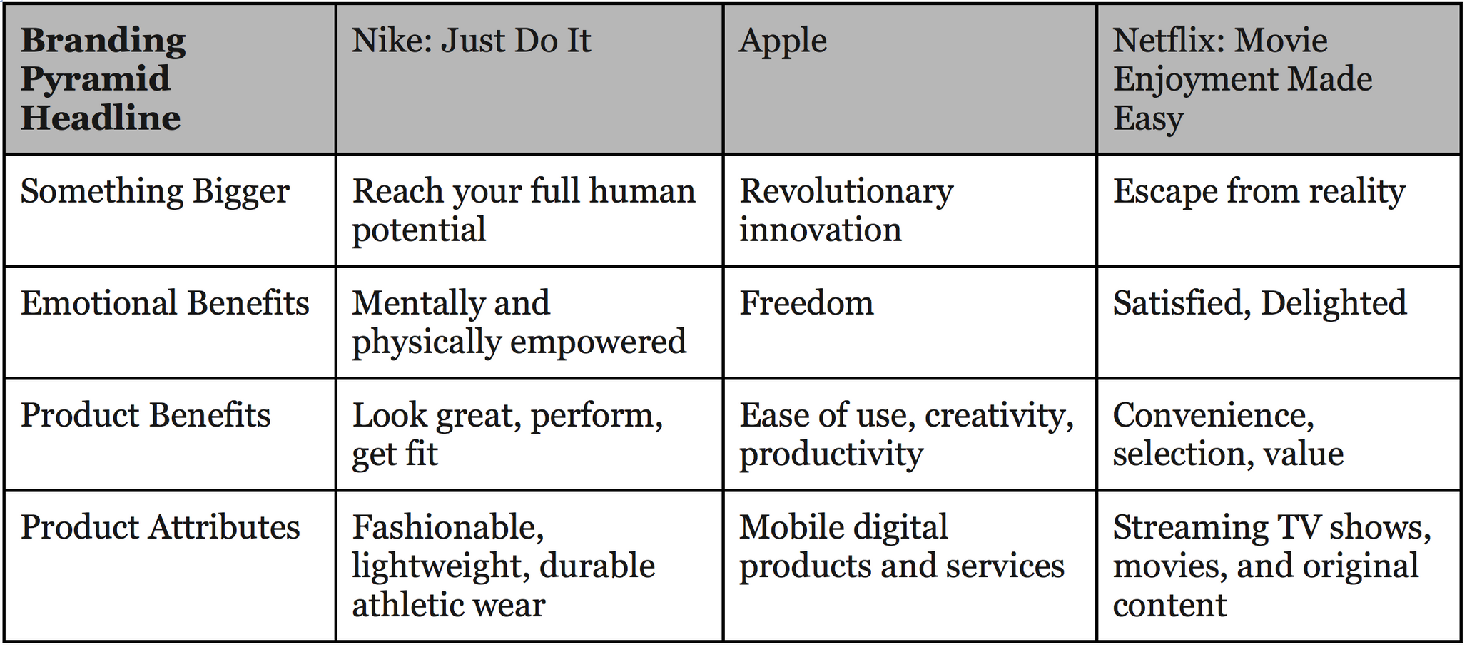 “The pyramid model is a way to 'level up’ from the attributes that define your product to the benefits it delivers. Then you can step into the emotional realm that makes a brand memorable. The ‘something bigger’ can anchor your brand for decades,” Biddle says. “At Netflix, what the product was changed over the years — from DVDs-by-mail, to streaming to original content. But the benefits — convenience, selection and value — remained the same. And the ‘something bigger’ — the escape from reality that a blockbuster summer movie delivered to each of us as kids — continues.”