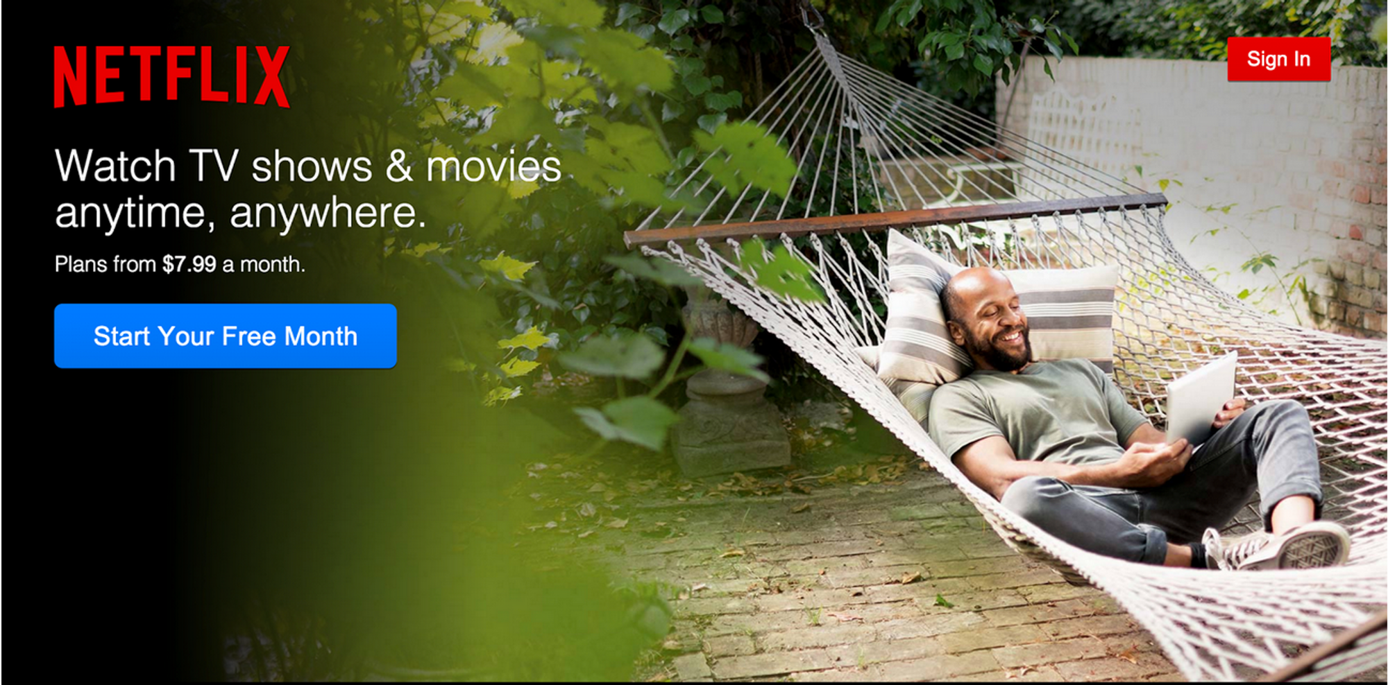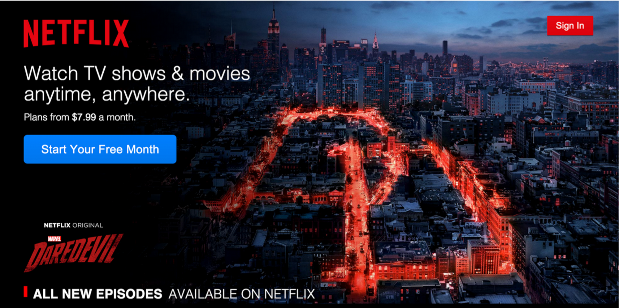 “Netflix has grown, but the non-member homepage continued to feature people on a couch — the embodiment of ‘movie enjoyment made easy’ — for more than a decade," says Biddle. "And today, things haven’t moved too far from that. If you look closely, today you’ll see a customer on a hammock, watching movies on an iPad. And it wouldn’t surprise me if the ‘Daredevil’ non-member homepage is a test — working to see if the promise of Netflix’s original content will inspire better conversion.”