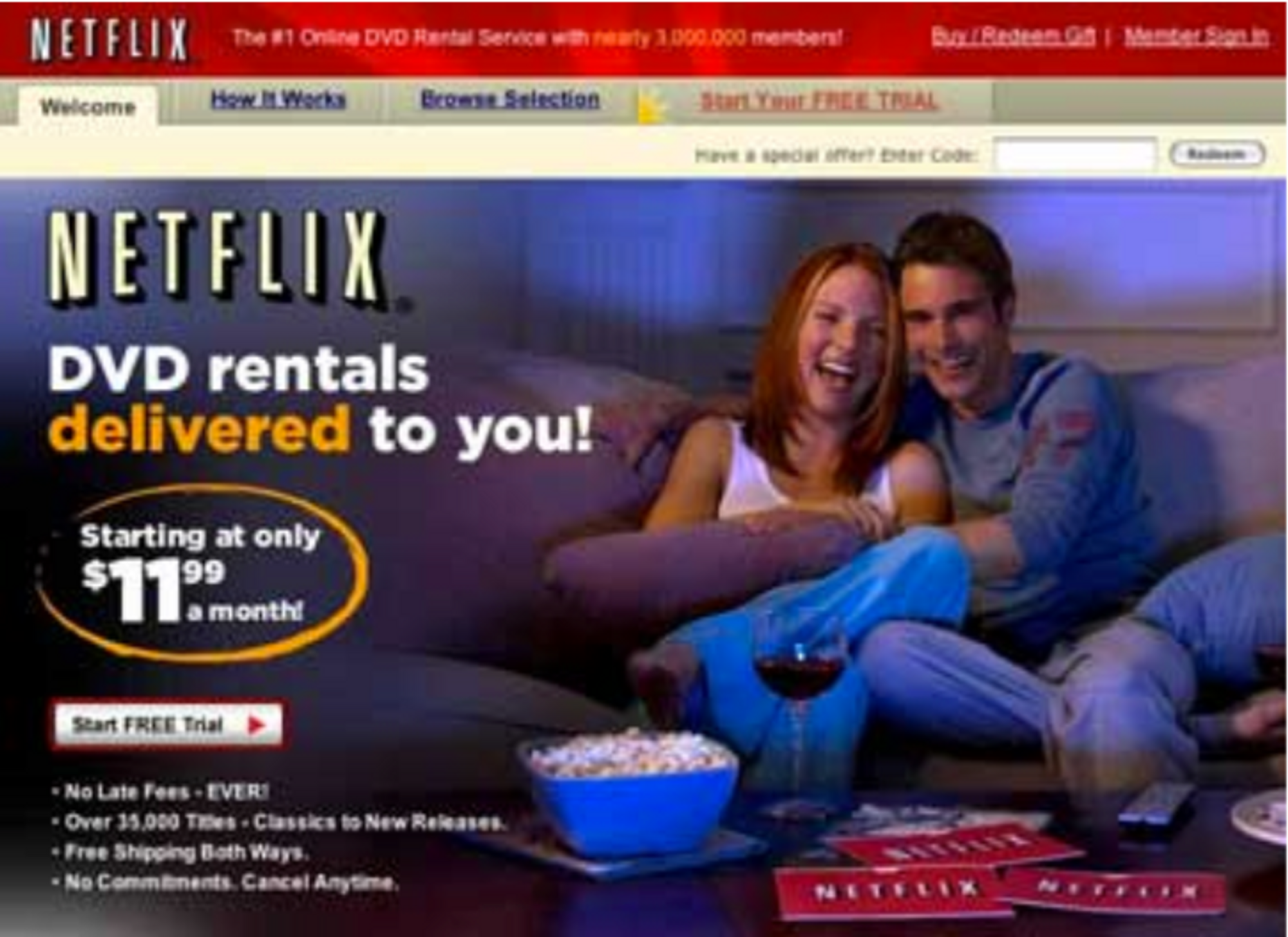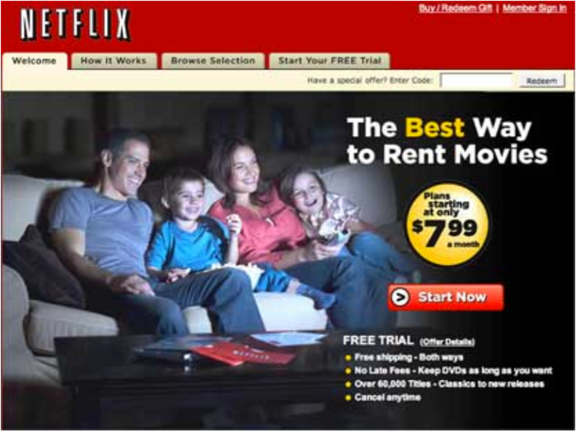 As people become more familiar with your brand and technology, a lot of the work you need to do to communicate what your product is and the benefits it delivers falls away. In the early days of Netflix, the non-member homepage was complicated. But over time, as the brand grew and successfully embodied the notion of “Movie Enjoyment Made Easy,” the work of communicating to customers got easier and easier, and, consequently the non-member homepage got simpler.