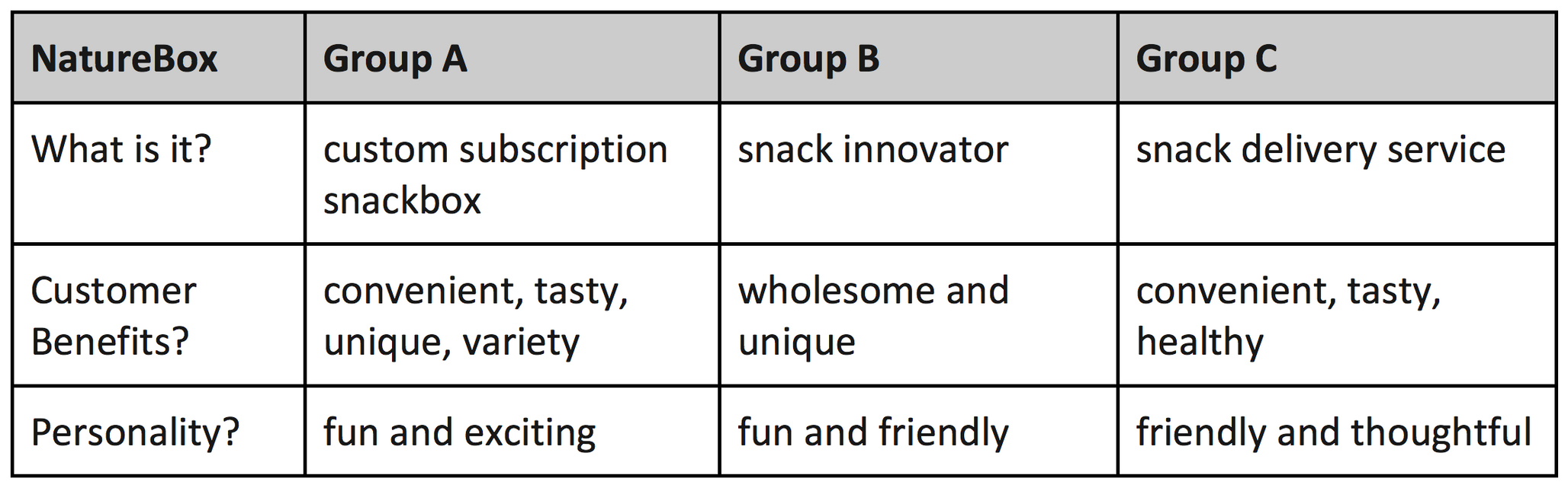 Biddle is strict on the economy of language in a positioning model. “Cut things down to three words maximum. Choose the most critical words.” At Naturebox, Biddle asked Group A to choose three of the four words describing their service so the team wouldn’t just list words, but carefully prioritize them. The team settled on “convenient,” “healthy,” and “variety.”