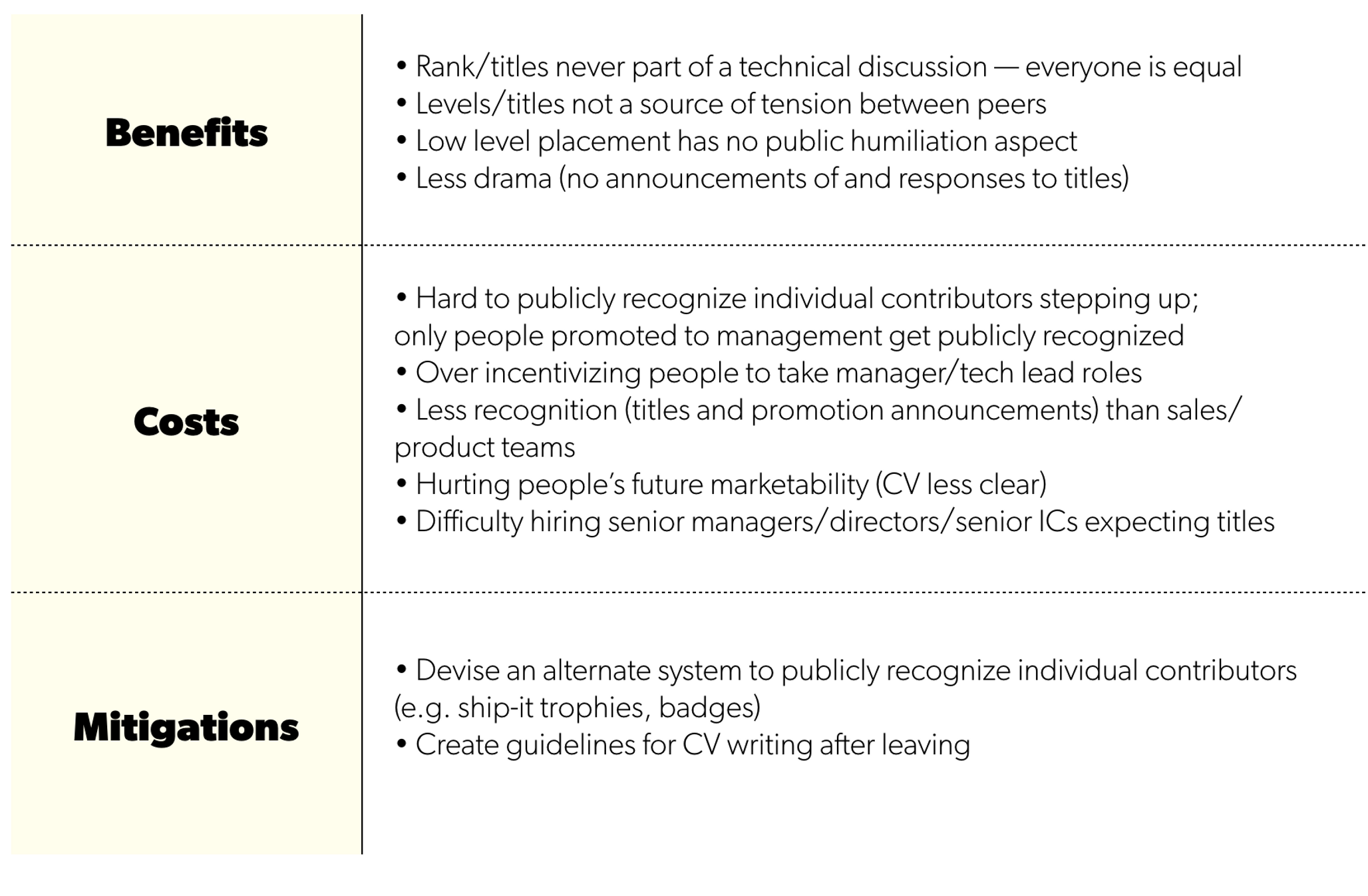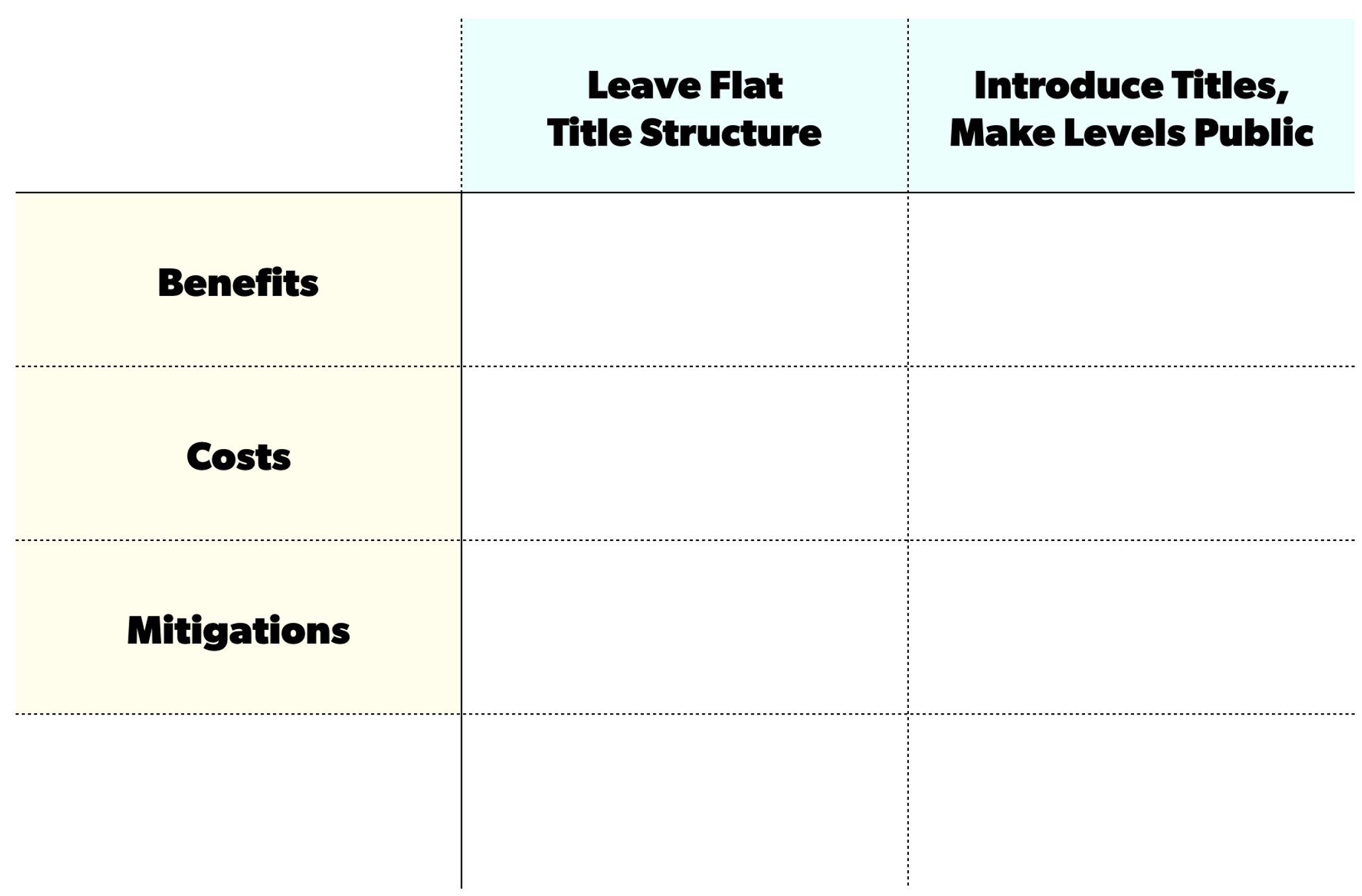Last year, Shklarski applied this framework to help Flatiron’s engineering team make a contentious decision. Should they have more descriptive job titles signifying seniority or not? In this case, the matrix helped defuse what could have been a very heated situation, and made everyone empathize with the tradeoff and feel more comfortable with the outcome. Here’s a detailed breakdown of how it worked.