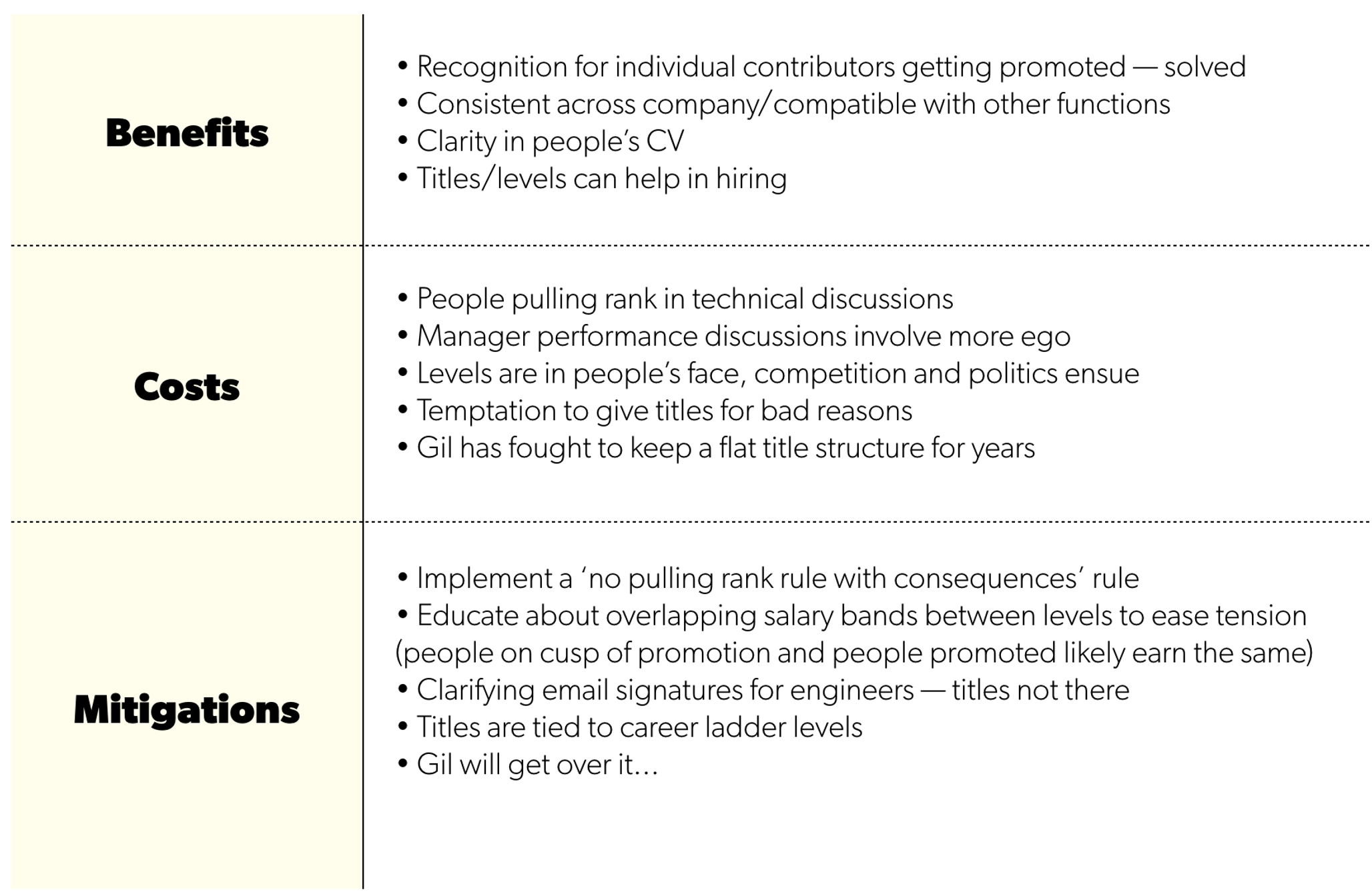In the end, the group decided to adopt titles because it would confer more benefits, and the associated costs could be mitigated to an acceptable level. Essentially, there was more to gain and it was possible to control losses.