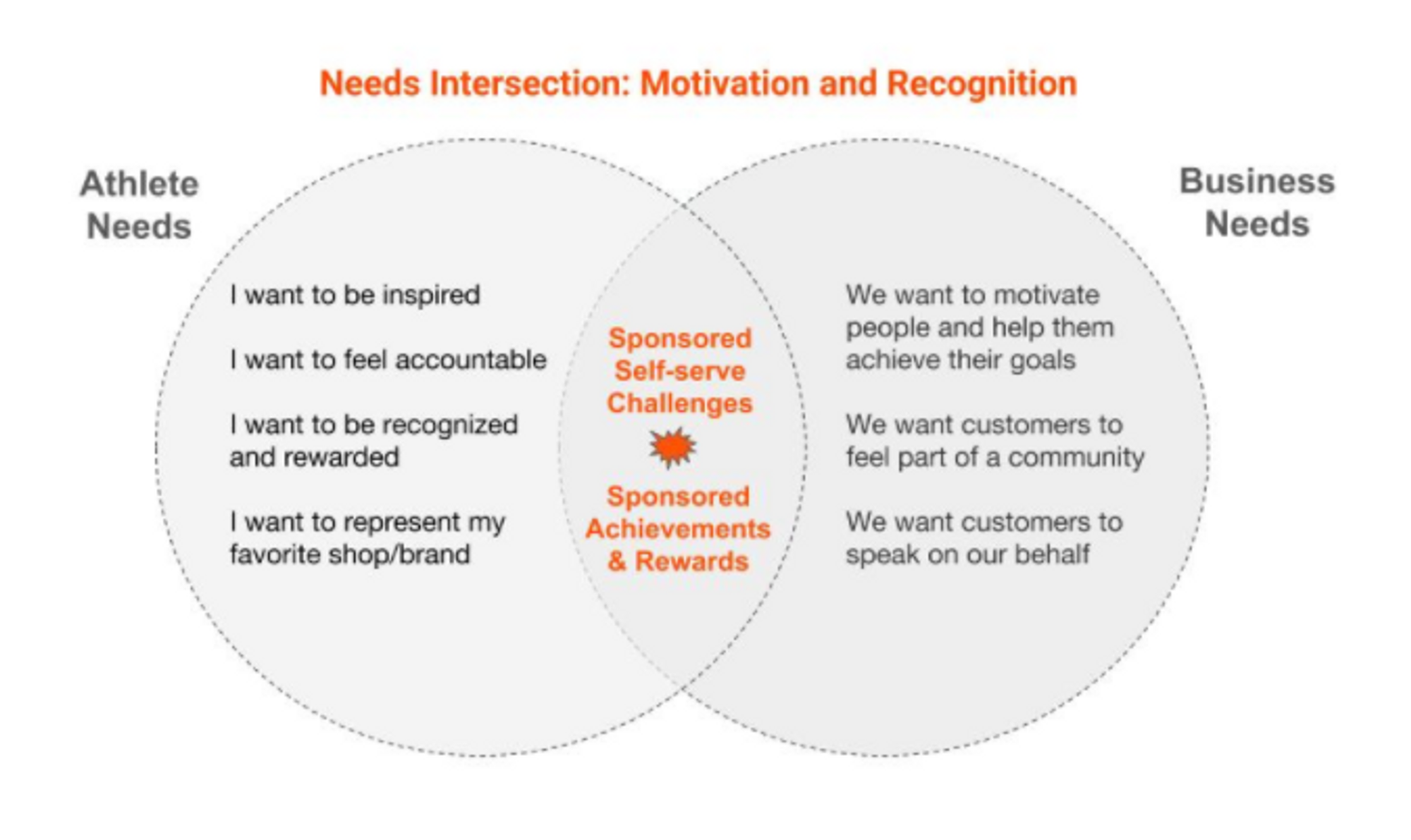 In the example above you can see how Strava has the opportunity to simultaneously support their community’s interest to be motivated and challenged with a sports brand’s desire to be a part of people achieving their goals. At the center of this intersection are several product ideas that the company will be testing in the coming months, creating more opportunities for achievement and reward in their experience.