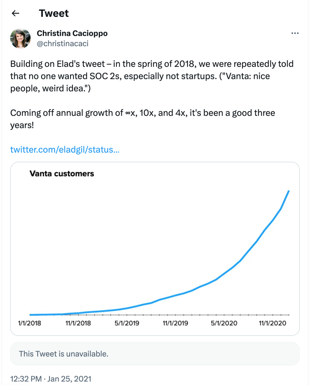 “Now that we feel very confident in our ability to get SOC 2s (we've gone from that first one to literally 1000s), it's really about finding other ways for companies to uplevel their security and demonstrate that to grow their business. So we’re building things around trust reports and security status pages. That alignment of business growth and securing your company is really at the core of Vanta.”