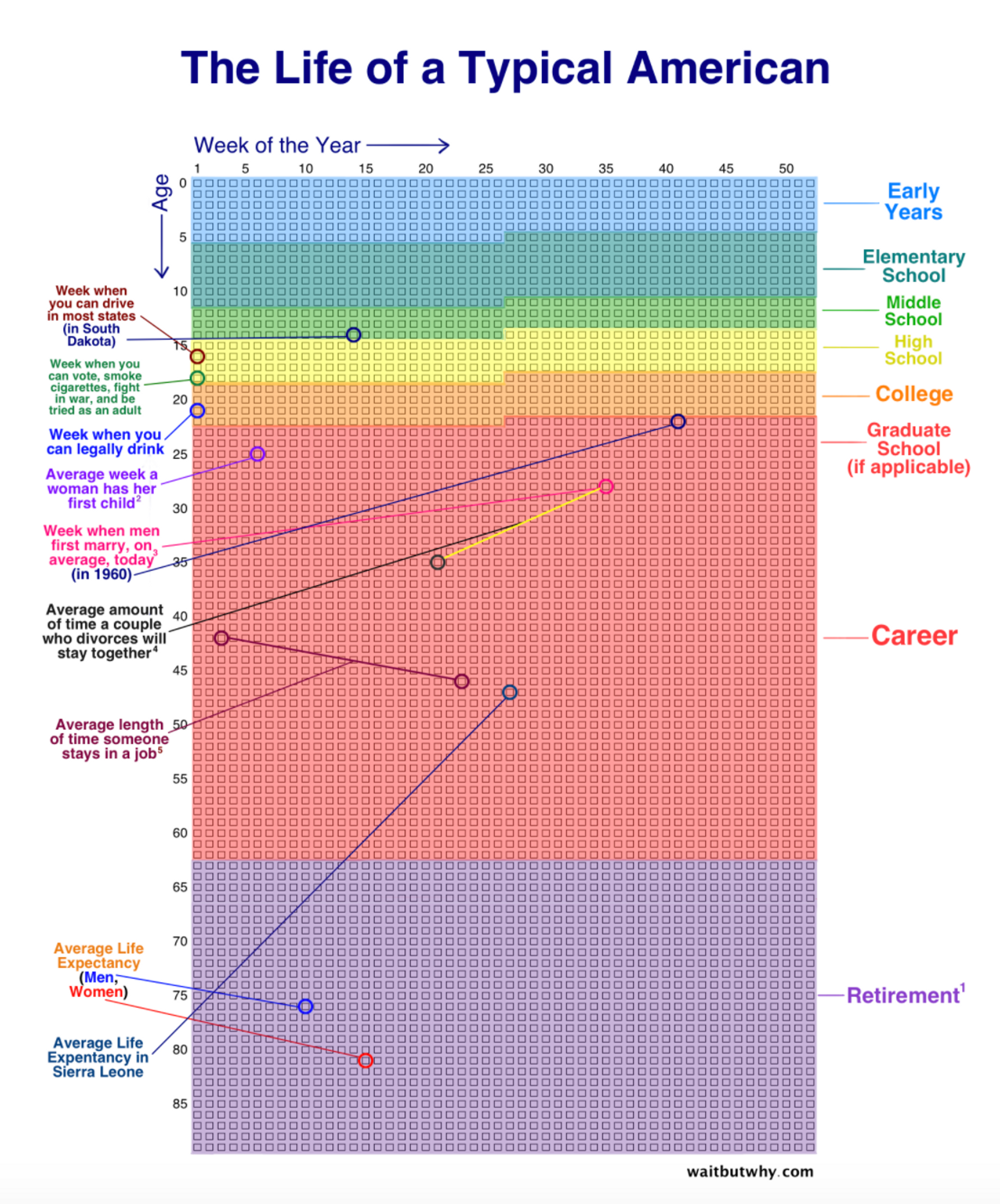 These questions can help show you if a graphic is augmenting a complex idea. A perfect illustration of this is Urban’s blocks of time post. In this case, the visual layout of the data was just a bunch of blocks, but the distance between them really made the point. A paragraph would have been much harder for most people to absorb the magnitude of the idea.
