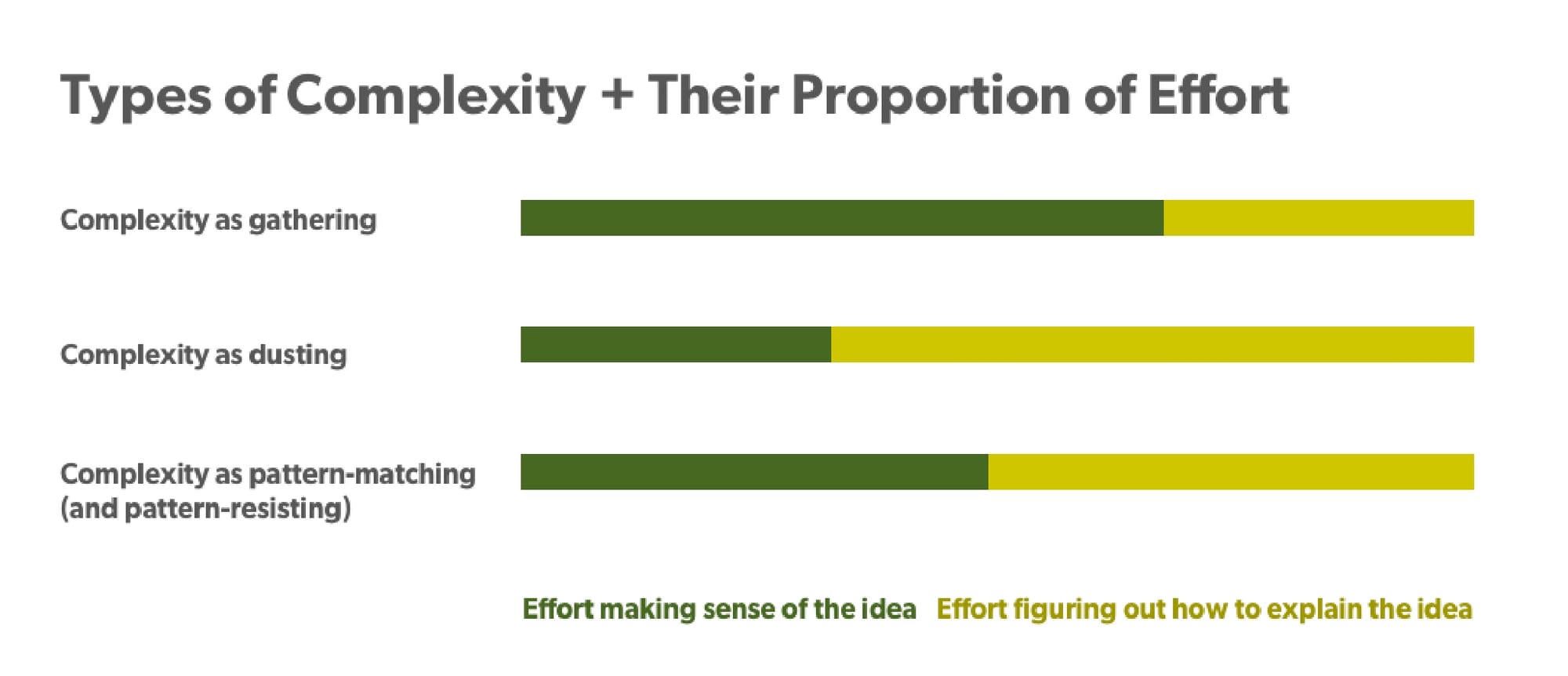 The first step is to identify what type of complexity you are attempting to unravel. Urban has observed a few main categories of complexity, each defined by the mix of actions needed to untangle it. Let’s call them: complexity as gathering, complexity as dusting and complexity as pattern-matching (or pattern-resisting). For each, there’s a different allocation of effort and time to disentangle a difficult concept.